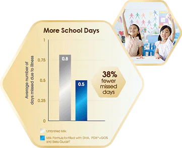Kanak-kanak yang minum susu yang diperkaya dengan DHA, PDX^ + GOS dan Beta-Glukan▲ telah menunjukkan peratus kehadiran yang tinggi ke sekolah, lantas memberikan lebih banyak peluang untuk mereka menuntut ilmu.
